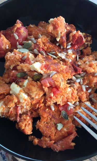 - Ajouter la fêta que tu auras coupé en dés.Astuces: tu peux façonner des petits ❝steaks❞ pour ma part je n’avais vraiment pas le temps et malgré l’aspect visuel peu attirant je me suis régalée….