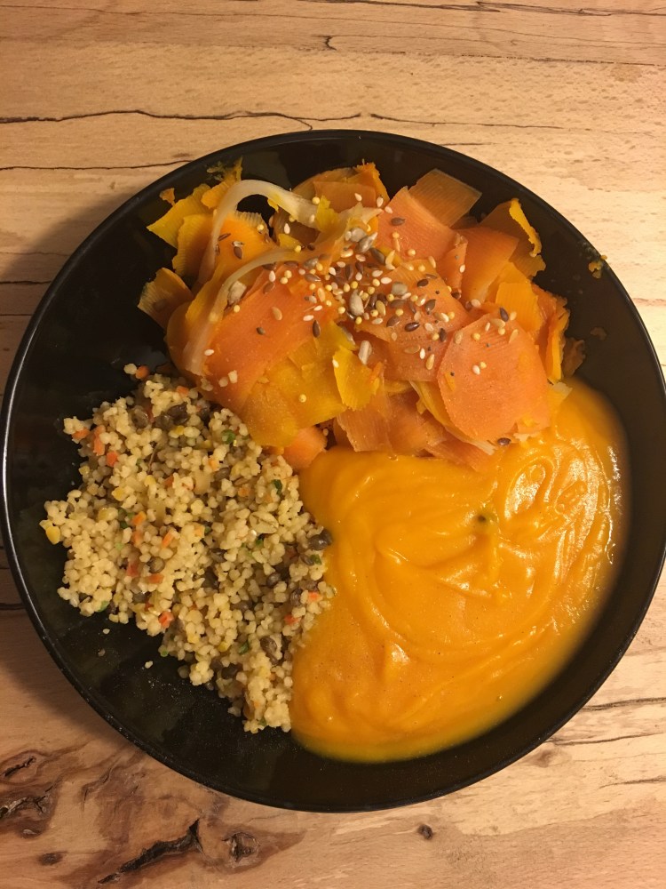 Récemment on a confectionné pour la famille une petite purée accompagné de légumes vapeur et d’un mix céréales légumes secs ♡