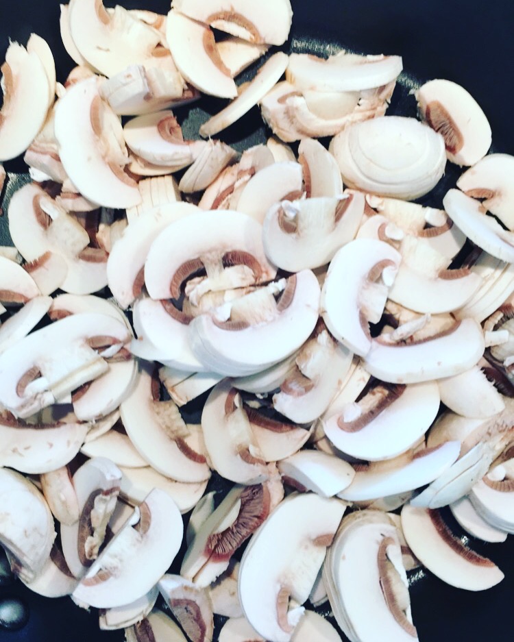 - Laver et découper les champignons en lamelles. Les faire revenir avec un peu d’huile d’olive et la gousse d’ail pressée et faire revenir dans une poêle avec 1 càs d’eau