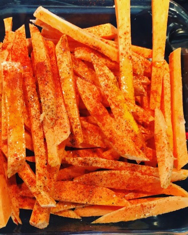 - Dans un plat, mélanger les frites de potiron avec l’huile d’olive (1càs) un peu de sel, poivre et de paprika. Les disposer sur la plaque de four revêtue d’un papier beurre ou d’un tapis special cuisson.