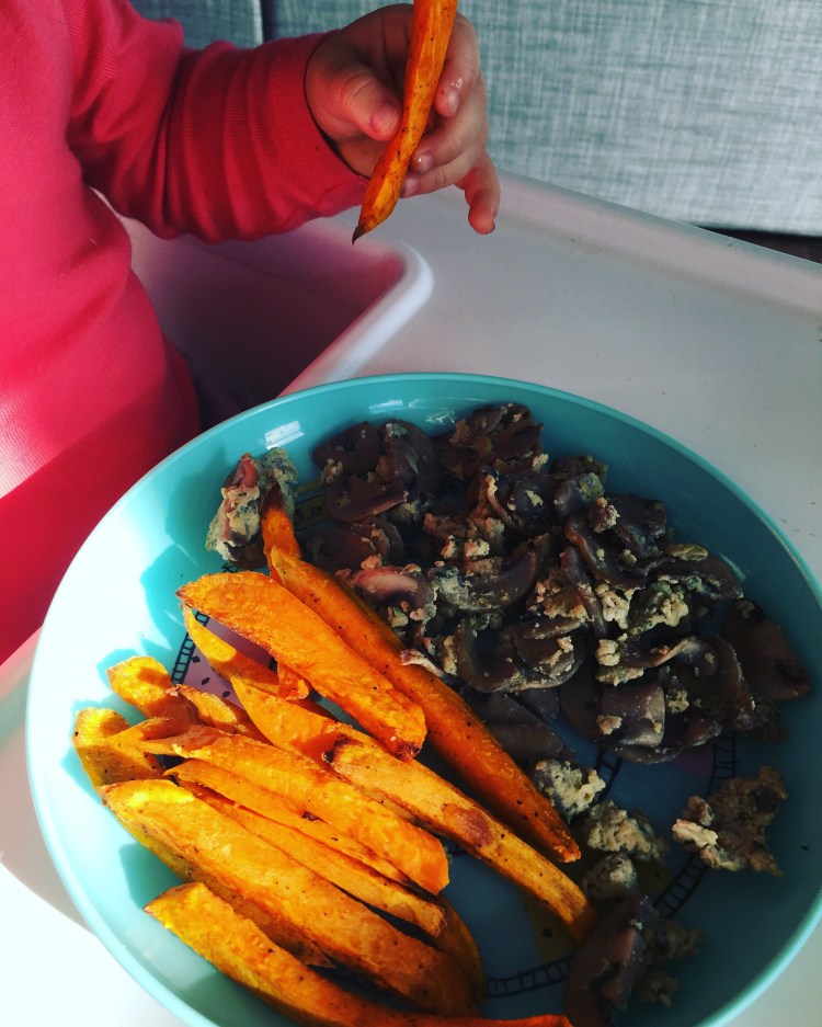 Elle a su manger toute seule et à bien mangé. Nous sommes toujours dans une période bizarre avec Ꮥienna-ℛose qui un coup veut du mixé un coup des morceaux, elle raffole des saveurs, donc j’alterne les épices et joue avec l’assaisonnement, j’ai mis un peu de sel sur les frites mais sinon je sale très rarement. Je ne suis déjà pas fan de base.