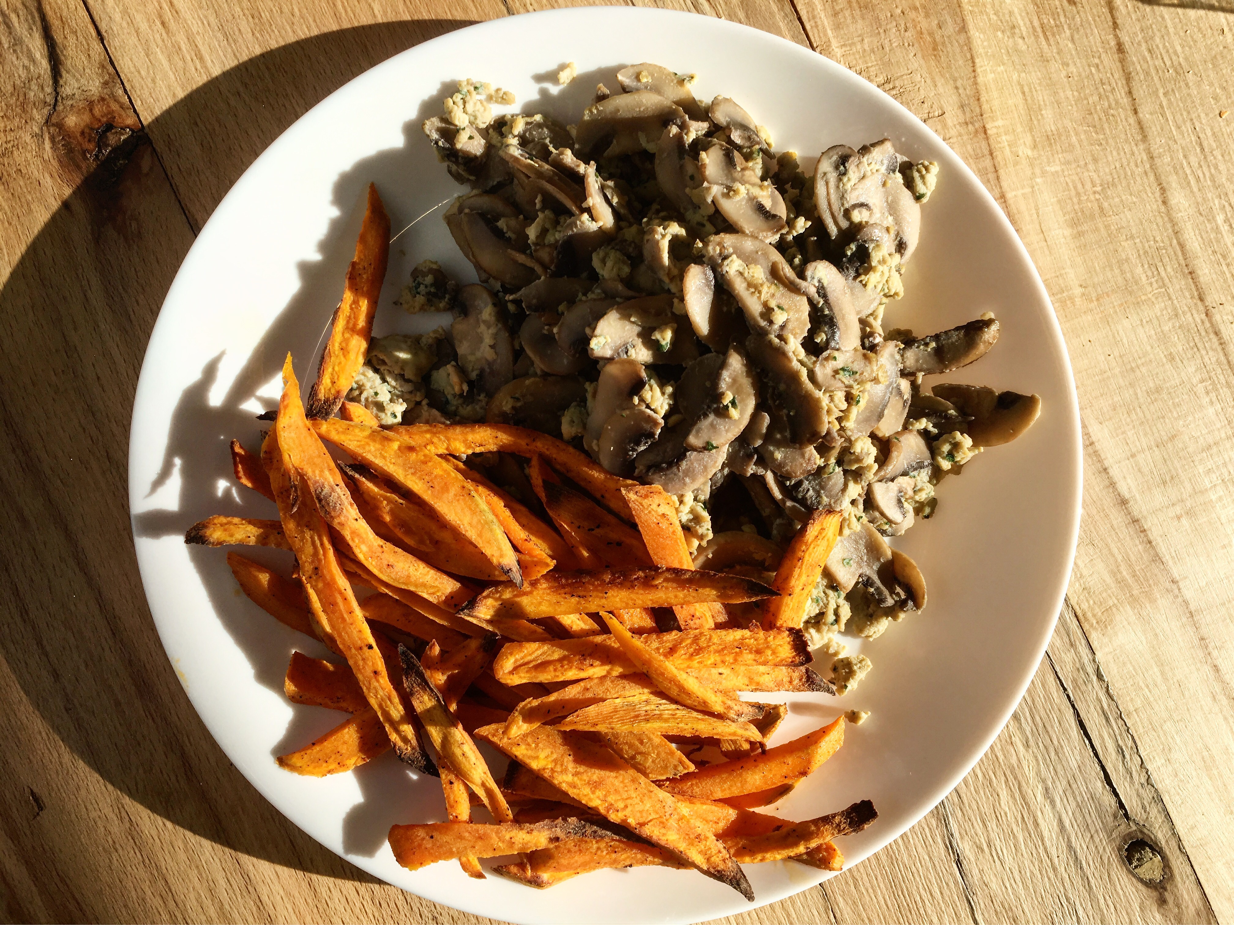 Une brouillade d’oeufs aux champignons avec des frites maison de potiron au four. (Petit clin d’œil à mon article précédent et les frites de panais).