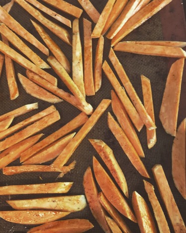 - Dans un plat, mélanger les frites de potiron avec l’huile d’olive (1càs) un peu de sel, poivre et de paprika. Les disposer sur la plaque de four revêtue d’un papier beurre ou d’un tapis special cuisson.