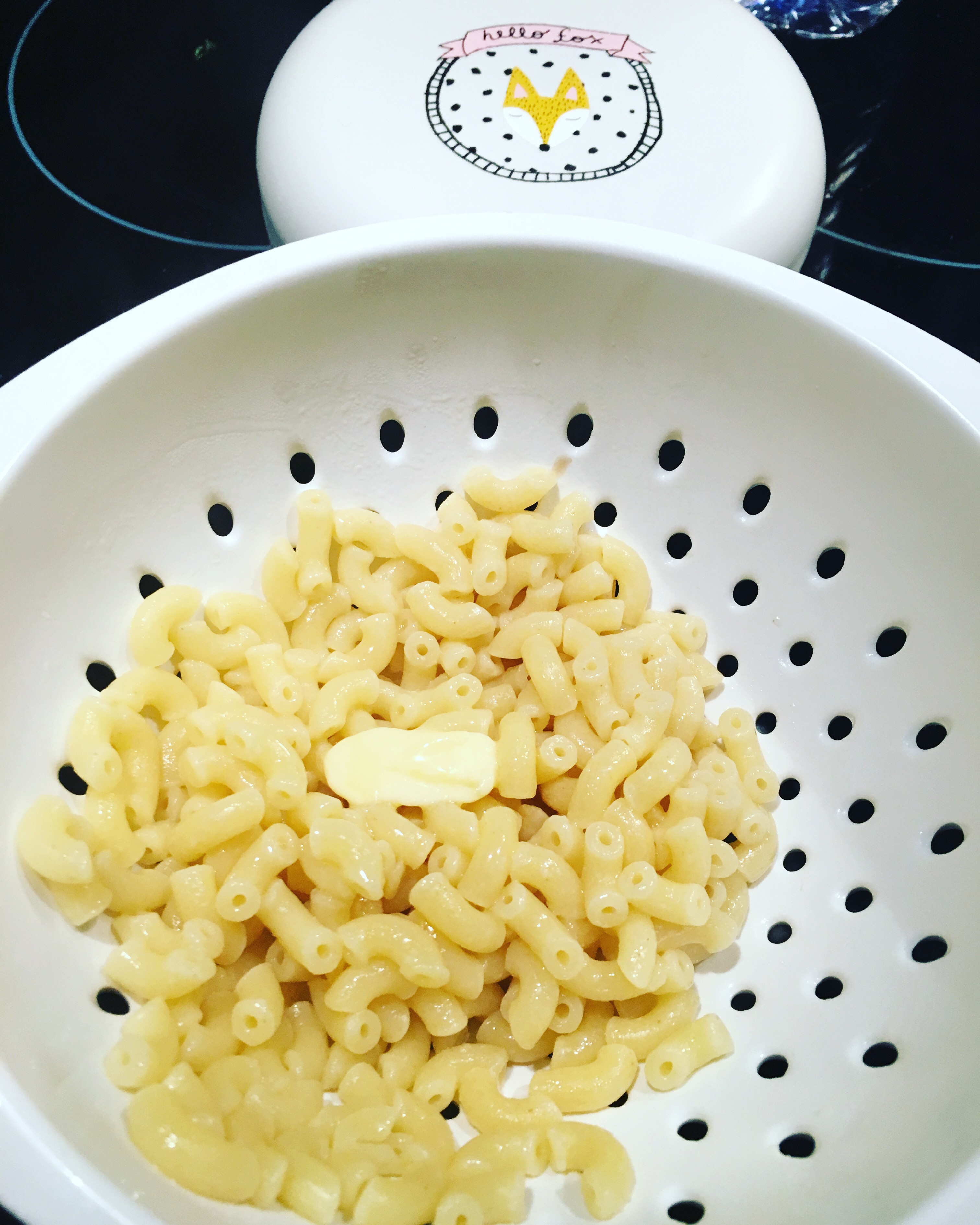 - Sur le côté, cuire les coquillettes selon le temps de cuisson indiqué sur le paquet. Une fois les pâtes égouttés, ajouter la noisette de matière grasse.