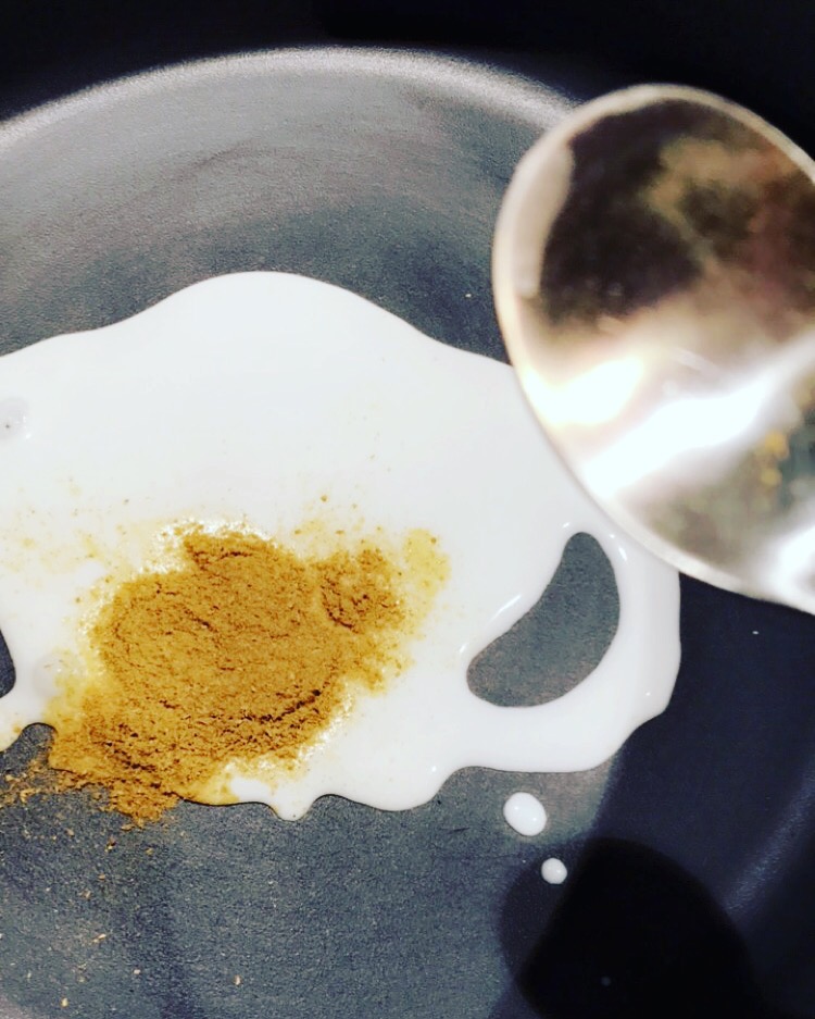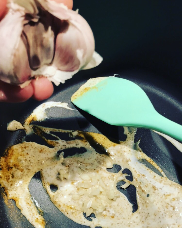 - Faire chauffer 3 cuillères de crème de coco avec la gousse d’ail écrasée pendant 1 bonne minute et ajouter la pâte de curry (ou la poudre), laisser cuire en remuant pendant 4 minutes.
