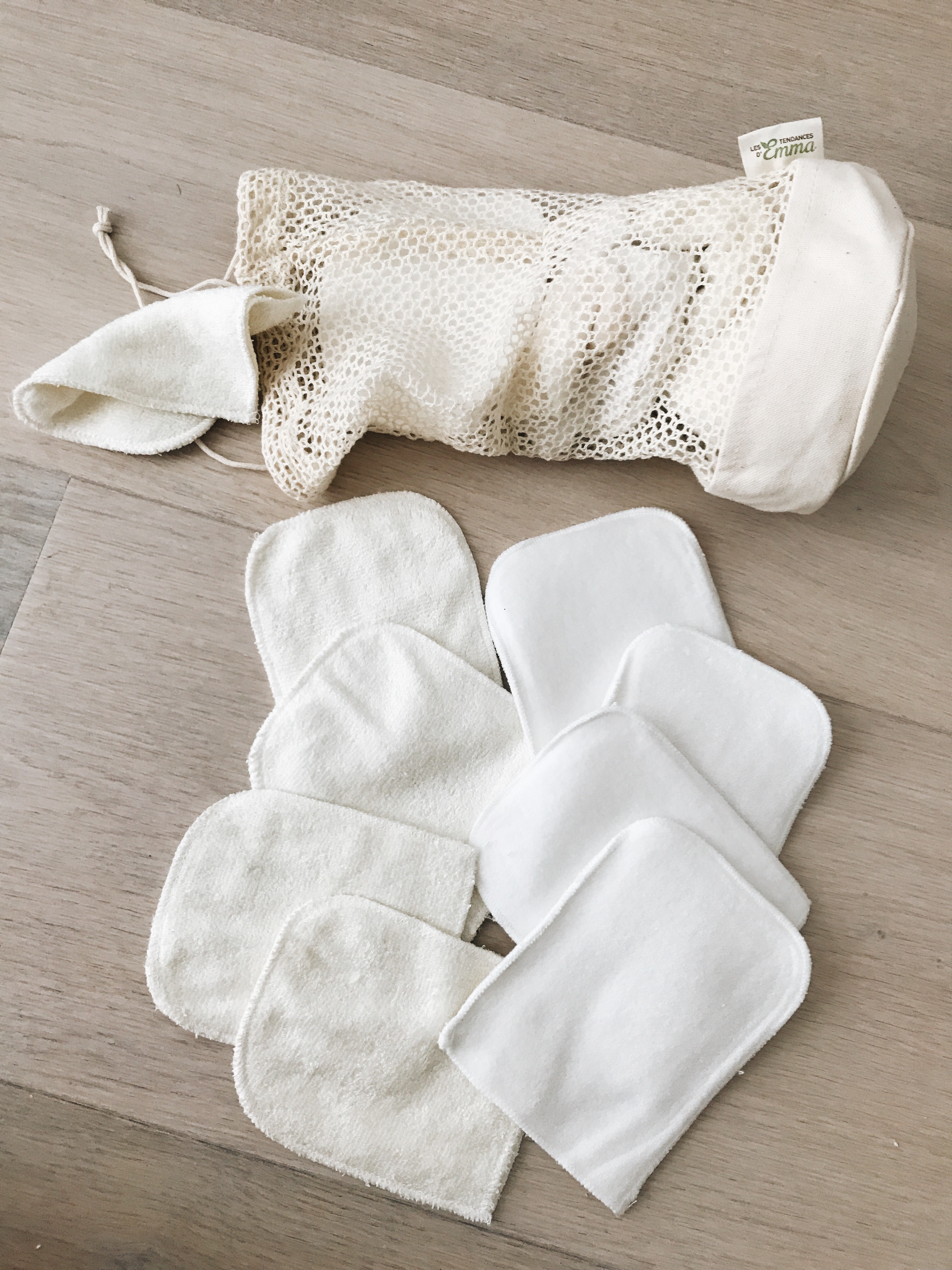 Je suis toujours aux cotons jetables que je termine et aux carrés lavables + gants de change pour les selles ( bambous, eucalyptus) de chez les tendances d’Emma.