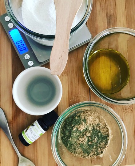 Je prépare chaque pot avec les ingrédients pour me faciliter la tâche lors de la réalisation, donc tout est pesé et prêt pour la fabrication.