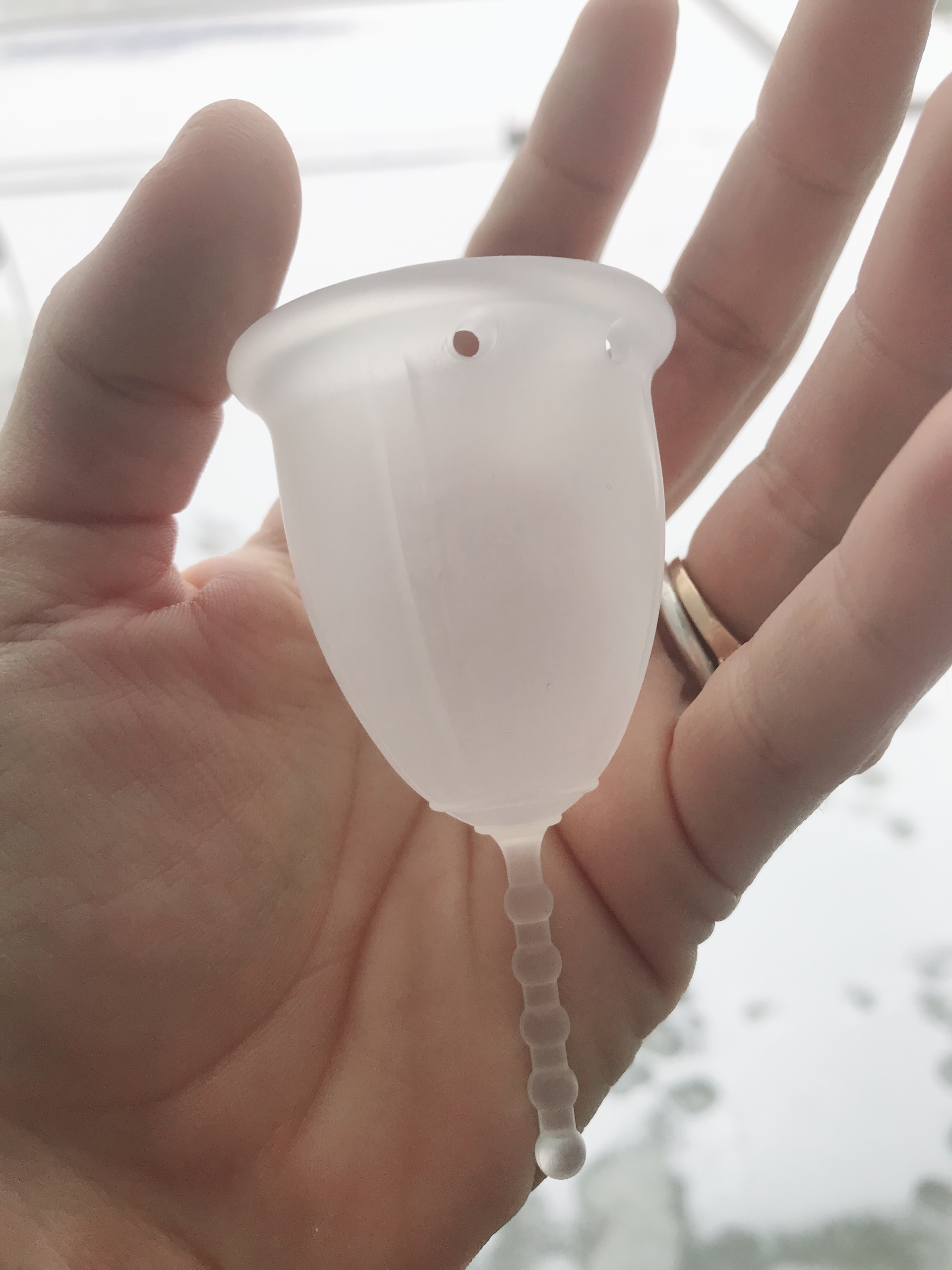 Grande tige que l’on peut couper, c’est donc une cup ajustable. Je trouve la longue tige rassurante au début. Les trous sont très grands, c’est idéal pour faciliter le retrait.