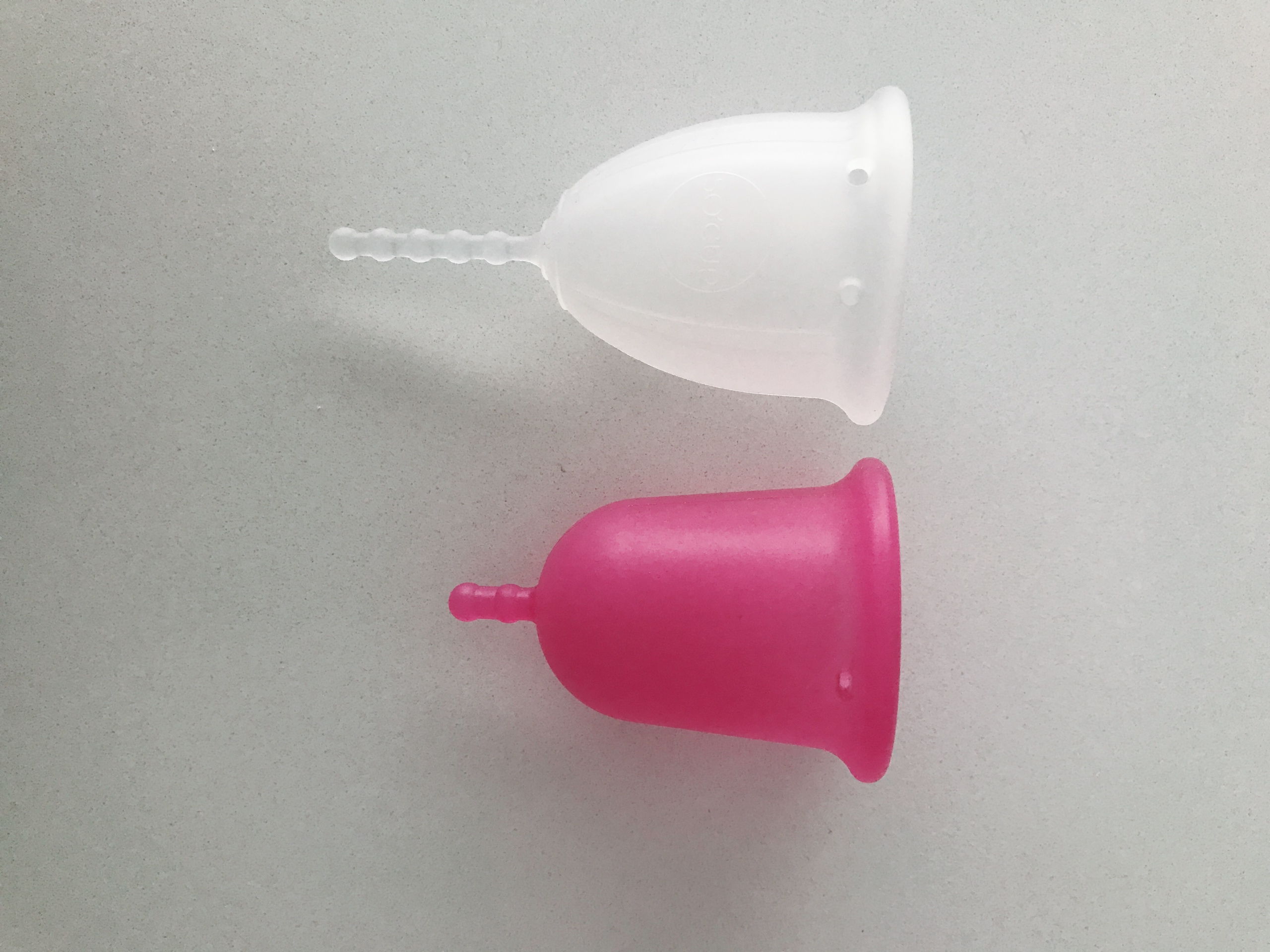 MÏU CUP : texture veloutée, son coté lisse me plait beaucoup, plus facile à nettoyer.. Petite tige avec deux boules, on peut donc couper également cette tige même si je ne trouve pas que cela soit gênant (on a pas toutes la même morpho). Les trous sont larges et de forme oblongue, idéal pour le retrait et moins de risque de boucher les trous aves les menstruations plus denses.