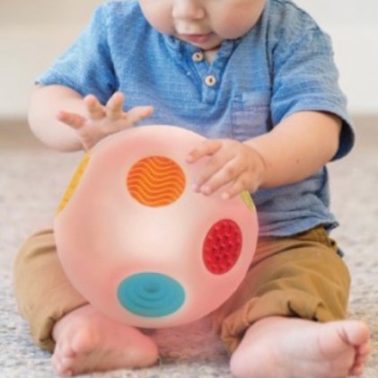 On arrive vite à la motricité de l’enfant et pour les 3 j’avais opté pour les balles sensorielles. Il y en a pour tous les goûts, elles sont assez chouettes à manipuler par les petites mains.