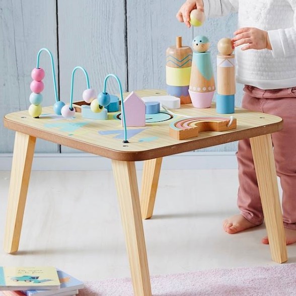 je trouve ces petites tables vraiment chouette car lorsque l’enfant souhaite se mettre debout, elles s’avèrent de bon partenaire (plus que le pousseur qui lui risque de bouger). Les filles se sont levées avec (elles l’ont fait grave bouger comme un pousseur d’ailleurs 😂😂😂).